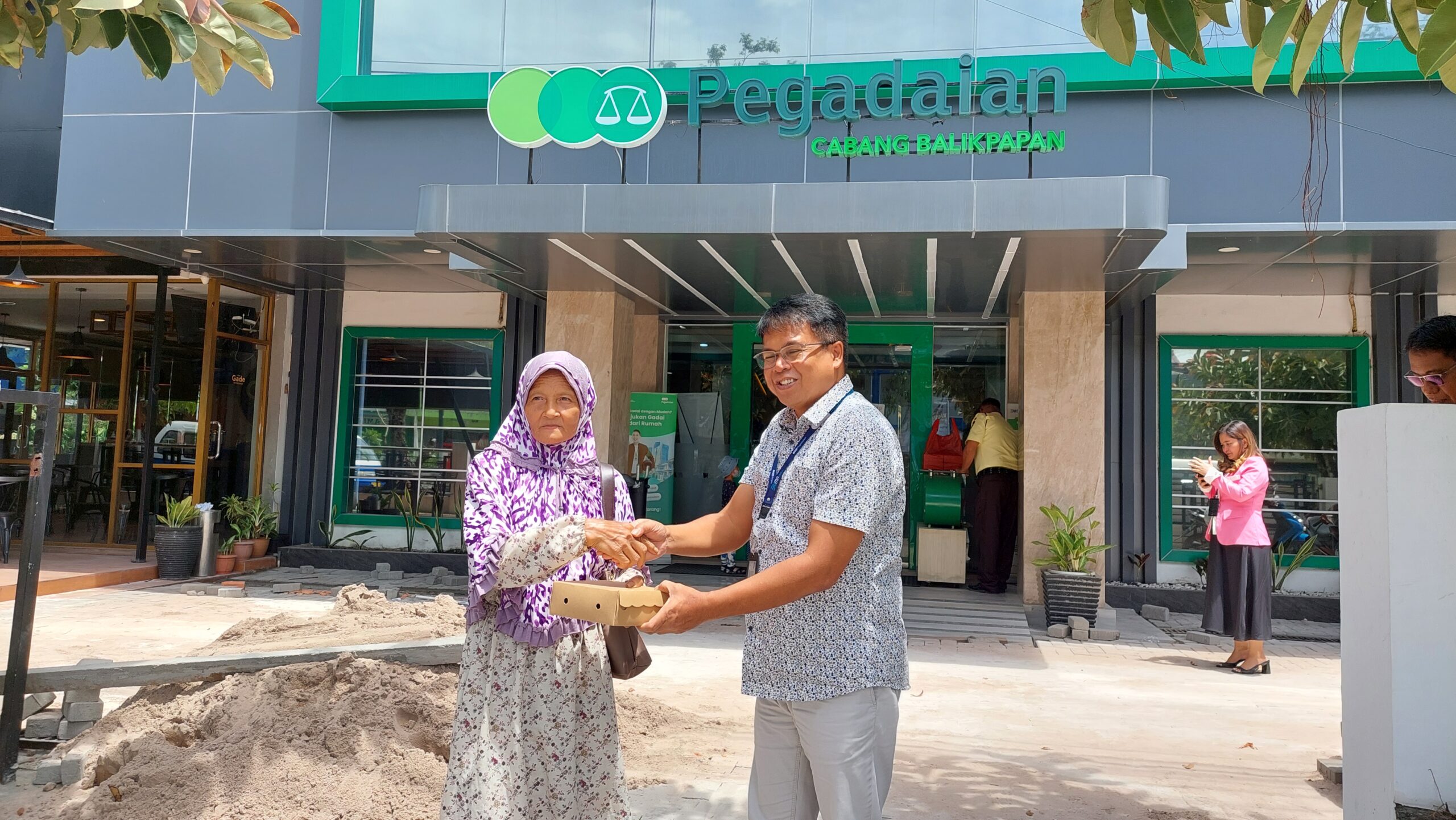 Manager PT Pegadaian Cabang Balikpapan Sutrisno didampingi Customer Relationship Officer Devi Asrini tampak bersemangat membagikan puluhan nasi kotak.